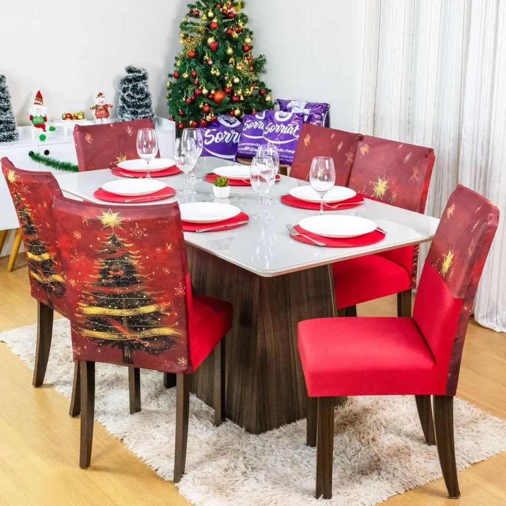 As capa de cadeira natalina elastex possui elástico em sua composição e se adaptam à diversos modelos de cadeiras.