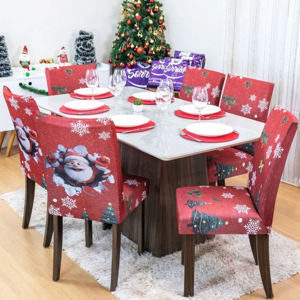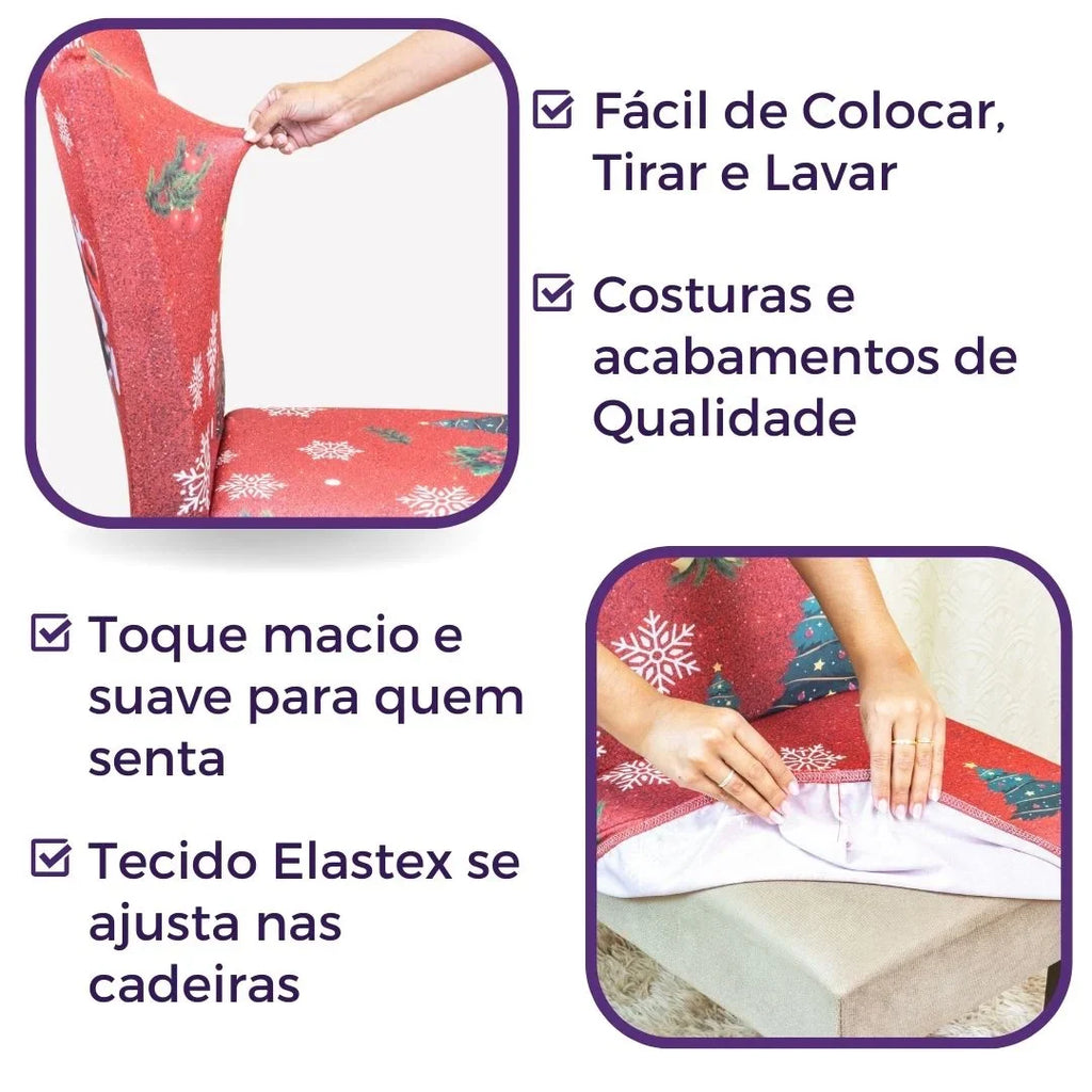 As capa de cadeira natalina elastex possui elástico em sua composição e se adaptam à diversos modelos de cadeiras.