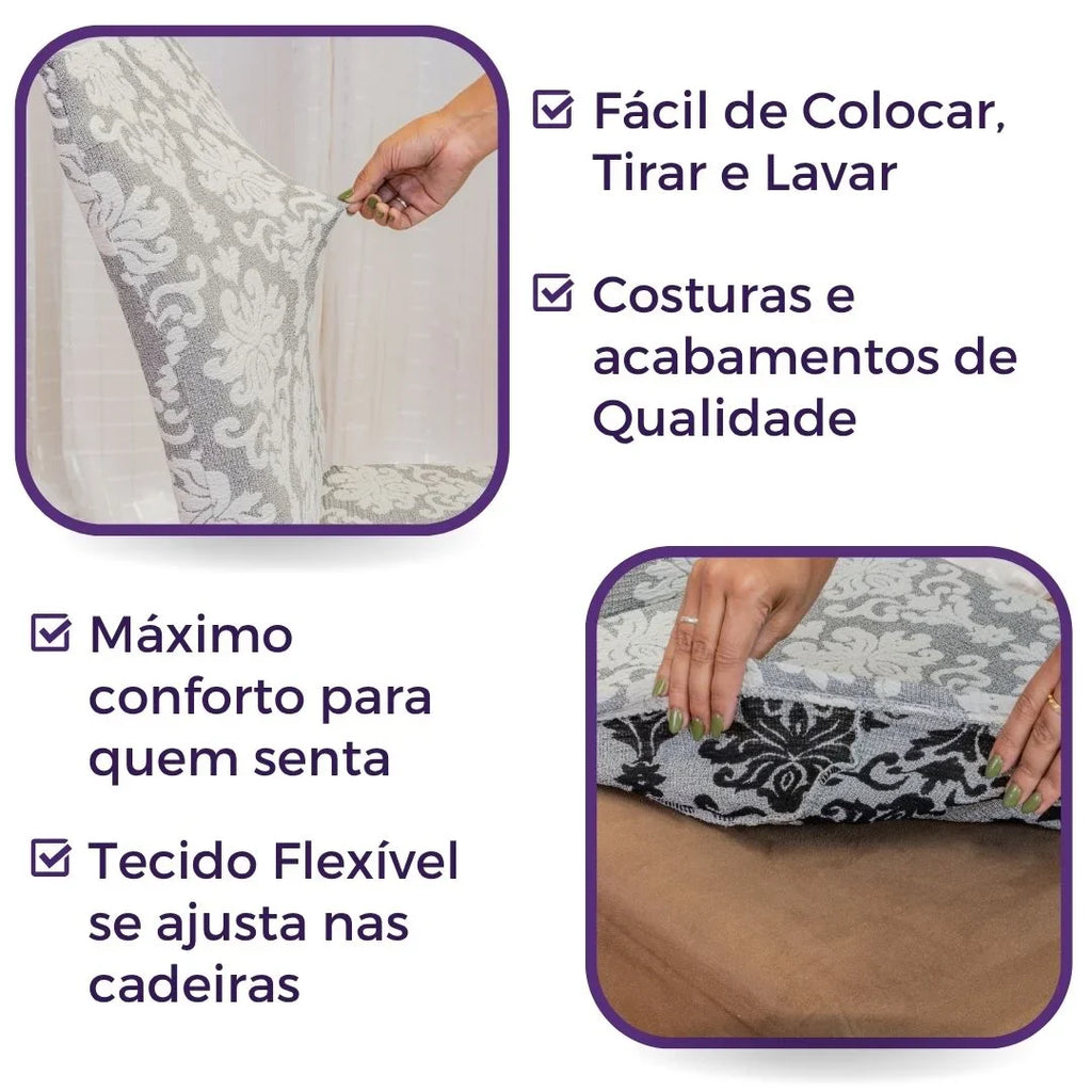 A Capa para Cadeira Boutique Veneza da Charme do Detalhe adapta-se facilmente a diversos modelos de cadeiras.